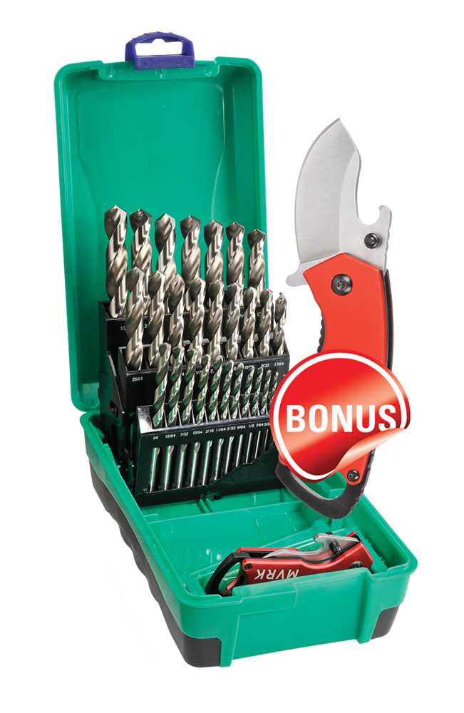 29 Piece Bright HSS Jobber Set 1/16-1/2 x 1/64" - Bonus Stubbie Folding Knife | ||