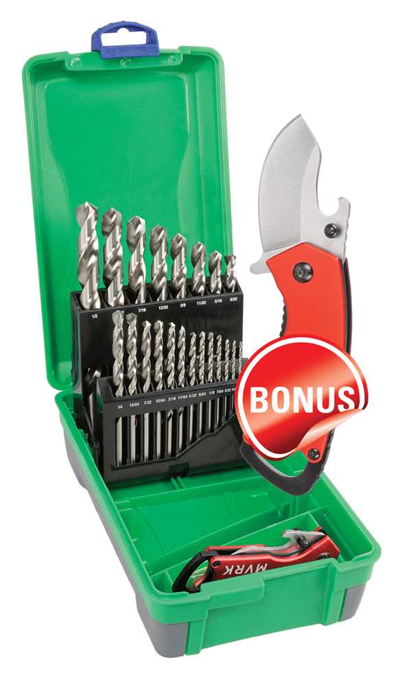 21 Piece Bright HSS Jobber Set 1/16-3/8 x 1/64" - Bonus Stubbie Folding Knife | ||