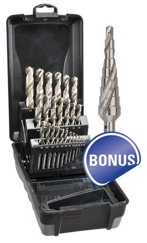 Saber 25 Piece Bright HSS Jobber Drill Set in ABS Plastic Case with BONUS Step Drill