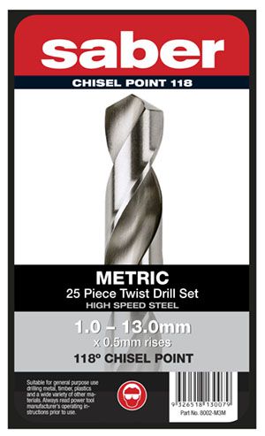 - Saber 25 Piece Bright HSS Twist Drill Set 1.0-6.5mm x 0.5mm rises, 7.0-13.0 x 1.0mm rises
