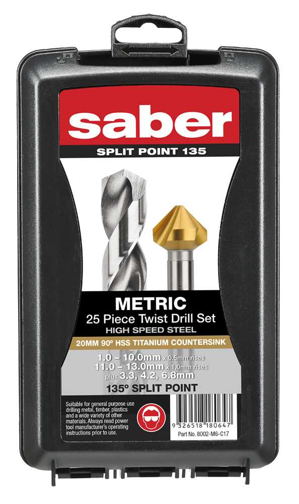 - Saber Metric 25 Piece Bright Finish HSS Twist Drill Set - Bonus 20mm Countersink