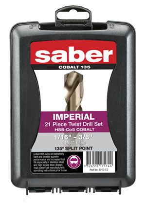 - Saber 21 Piece HSS-Co5 (Cobalt) Twist Drill Set 1/16" - 3/8" x 1/64" rises