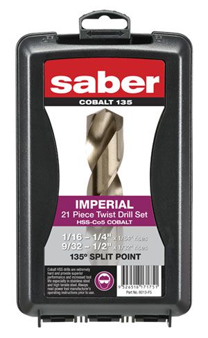- Saber 21 Piece HSS-Co5 (Cobalt) Twist Drill Set 1/16" - 1/4" x 1/64" rises, 9/32" - 1/2" x 1/32" rises
